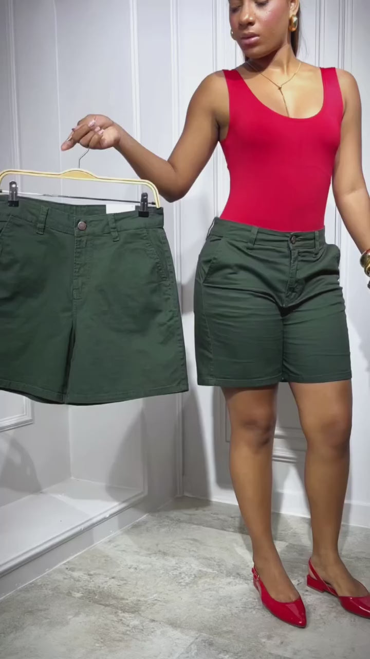 Esta bermuda en tono verde militar destaca por su diseño de tiro alto que estiliza y define la silueta con un ajuste impecable. Confeccionada en una tela estructurada de gran calidad, incluye detalles clásicos como bolsillos, pasadores para cinturón y un botón metálico contramarcado que aporta un toque de distinción. Es la prenda ideal para un estilo casual sofisticado, ofreciendo comodidad y versatilidad para cualquier plan de día.